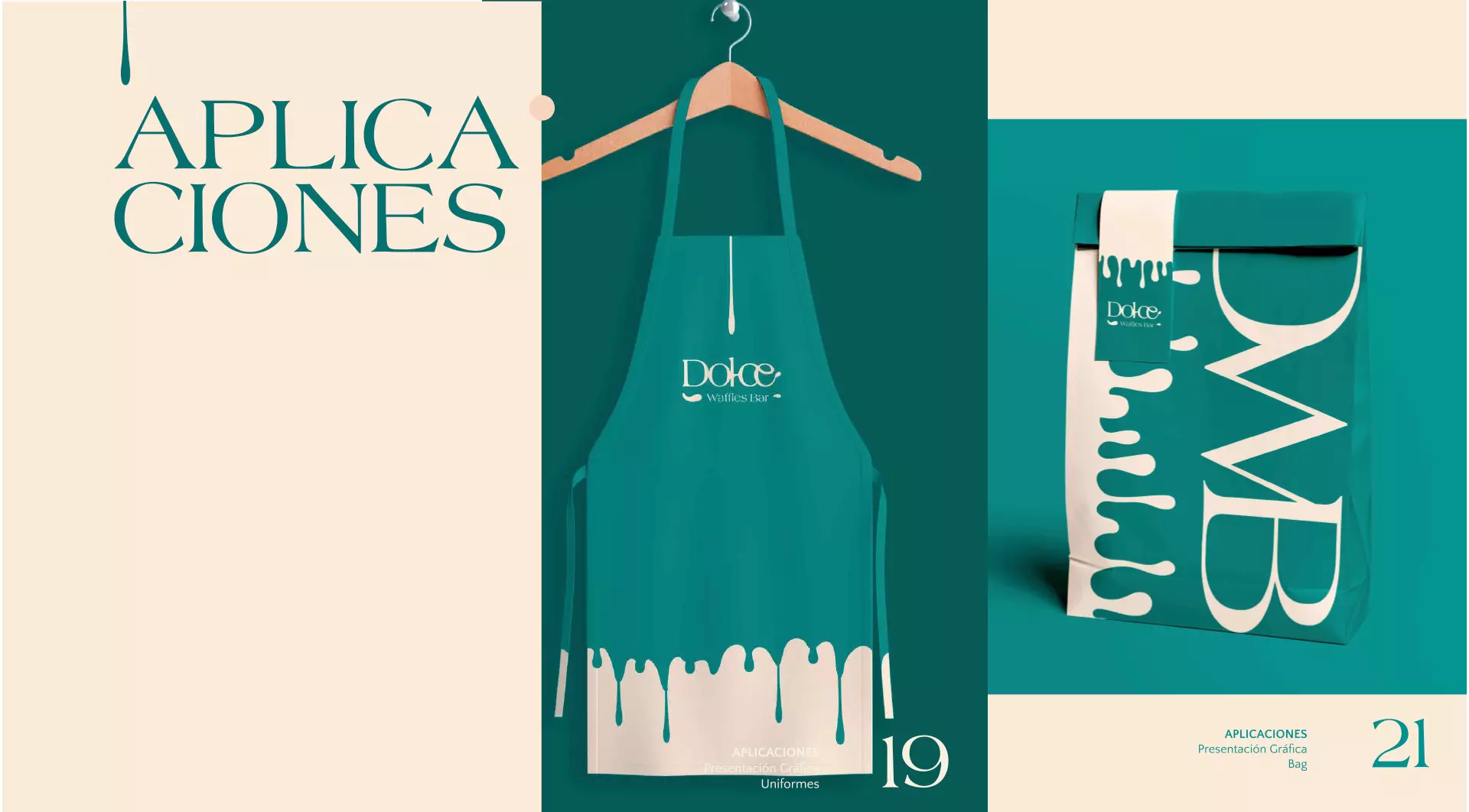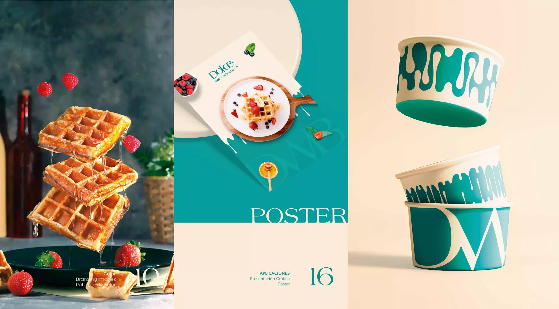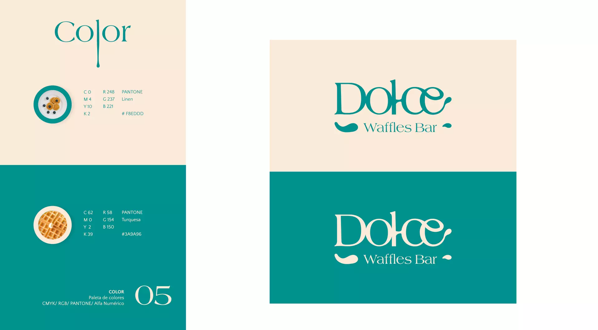 Nuestro equipo de diseño gráfico se guió por colores claros, como el verde y el azul, muestra de un tono fresco, relajante y equilibrado. Para lograr que la identidad de Dolce Waffles derrame dulzura, le dimos un toque bizcoso que representa la miel y esos sabores pegajosos que atraen a todos los amantes del dulce.